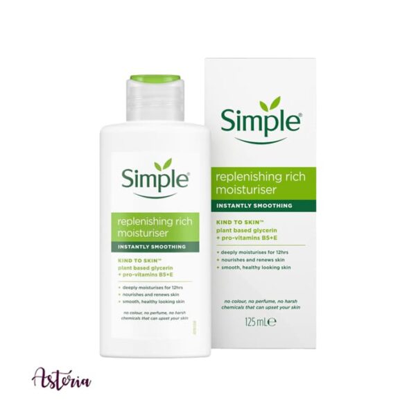 Simple Replenishing Rich Moisturiser instantly doubles your skin's hydration. It works for up to 24 hours, leaving your skin feeling silky and nourished all day. Carefully blended with skin-loving ingredients it's formula is enriched with Pro-Vitamin B5 and Bisabolol, to replenish, soothe, and hydrate your skin without the greasy feeling. Our facial moisturiser contains no colour or dye, no artificial perfumes, or harsh chemicals that can lead to skin irritation or clogged pores, making it perfect even for sensitive skin. Dermatologically tested and approved. Ophtalmologically tested. Hypoallergenic, non-comedogenic.