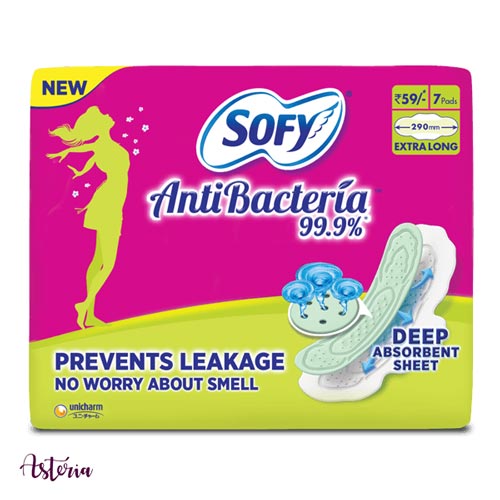 New Sofy AntiBacteria with DEEP ABSORBENT SHEET that prevents leakage and gives you 99.9% protection from bacteria that causes smell.